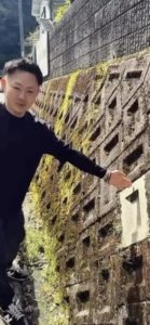 苔まみれのブロック塀の中で、